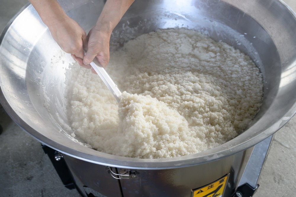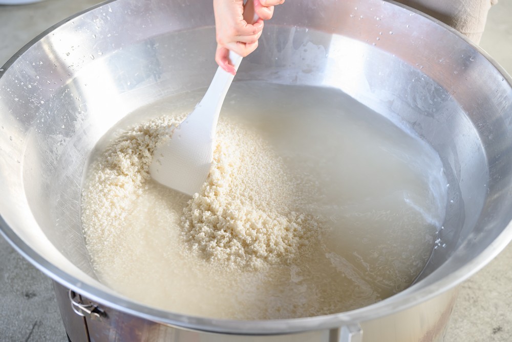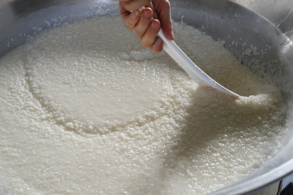 - 平釜に米を入れ、水17ℓのうち10ℓを加え、30分浸漬させる。