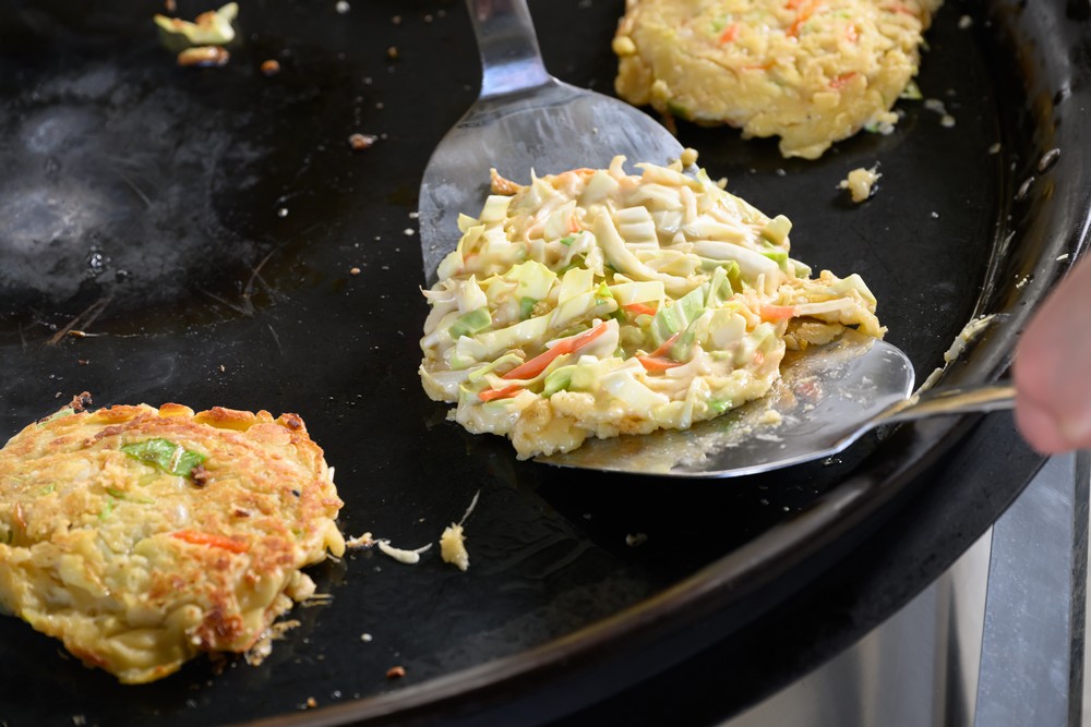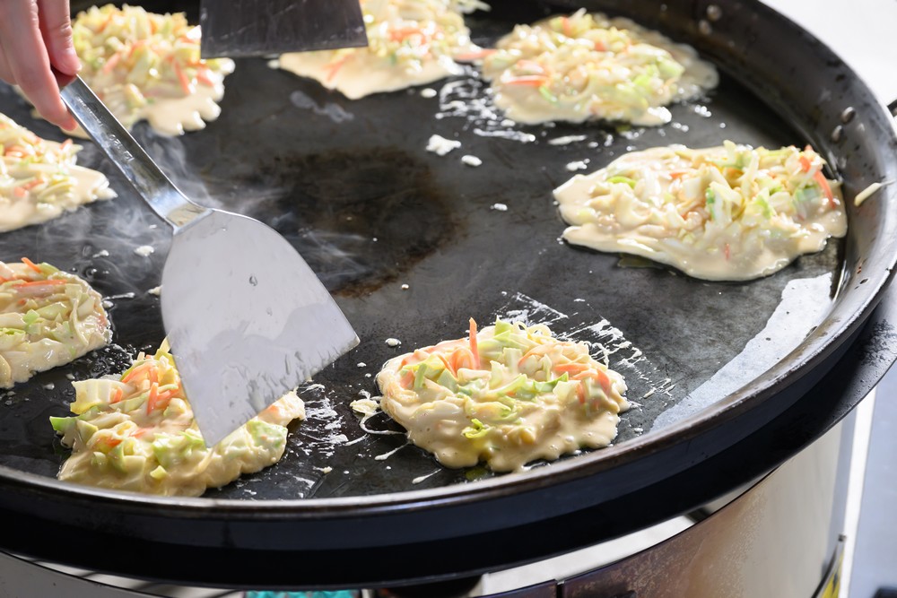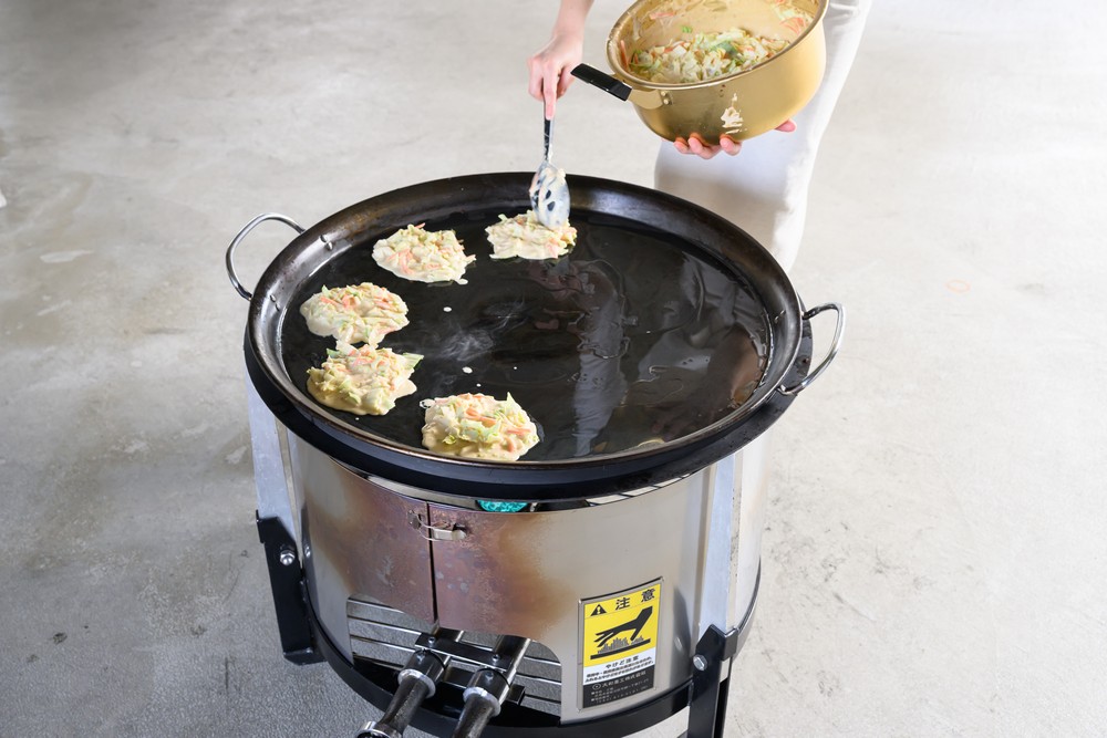 ふっくらと焼き上げた生地に、たっぷりのきゃべつと豚肉を重ね、香ばしく仕上げるお好み焼き。移動かまどのオプション「鉄板」を使用すると、よりおいしく焼き上げることができます。