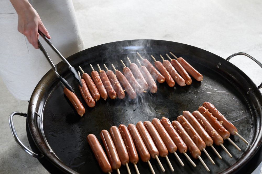 パリッとした食感とジューシーな肉汁がたまらないフランクフルト。移動かまどの鉄板で、じっくり火を入れることで、表面は香ばしく焼き上げながら、肉のうま味をギュッと閉じ込めます。