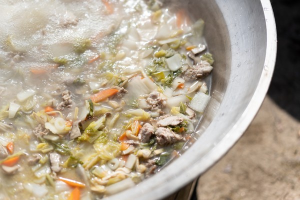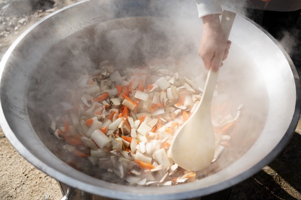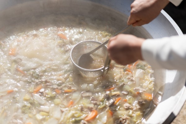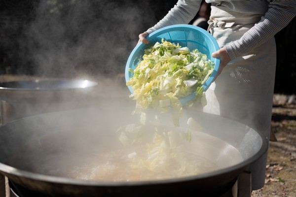 - 具材がやわらかくなったら、はくさい、しいたけ、長ねぎ、油揚げ、水6ℓを加えてさらに煮込む。★☆