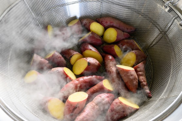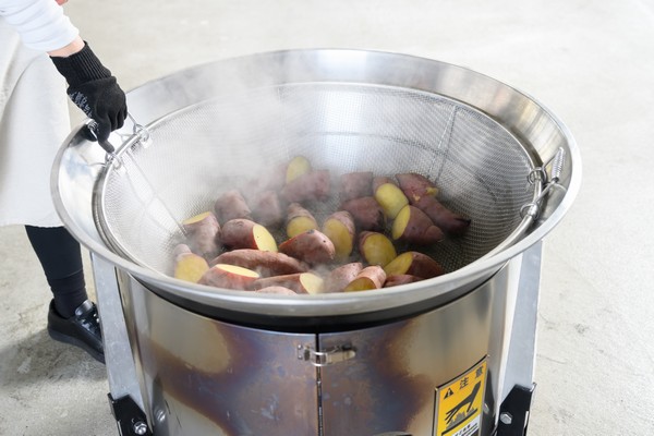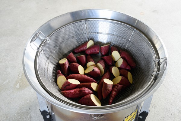 - 揚げザルにさつまいもを入れ、平釜にセットする。